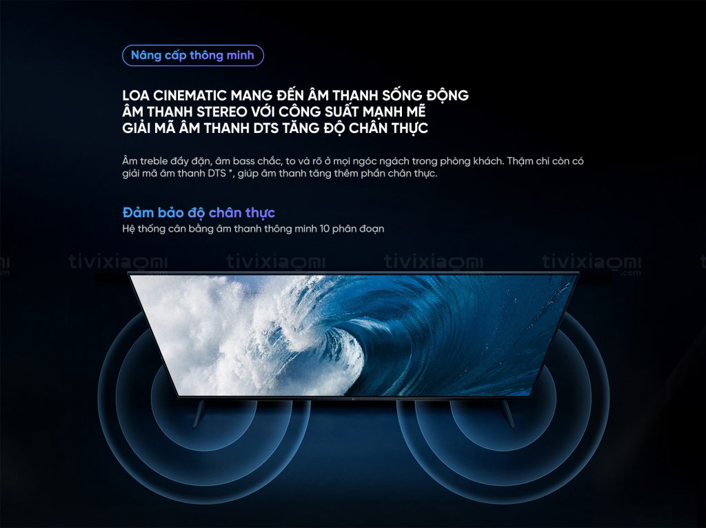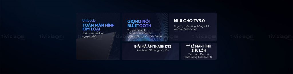 Unibody thiết kế tràn viền kim loại (thân vỏ nguyên khối). Điều khiển Bluetooth với trợ lý ảo Xiaomi AI thông minh thực hiện hành động bằng câu lệnh đơn giản. Giao diện MIUI TV 3.0 trực quan hỗ trợ nhu cầu giải trí và làm việc. Bộ giải mã âm thanh DTS tạo hiệu ứng âm thanh 3D công suất lớn. Tỉ lệ màn hình hiển thị cực lớn trên 90% và công nghệ PO hoàn toàn mới