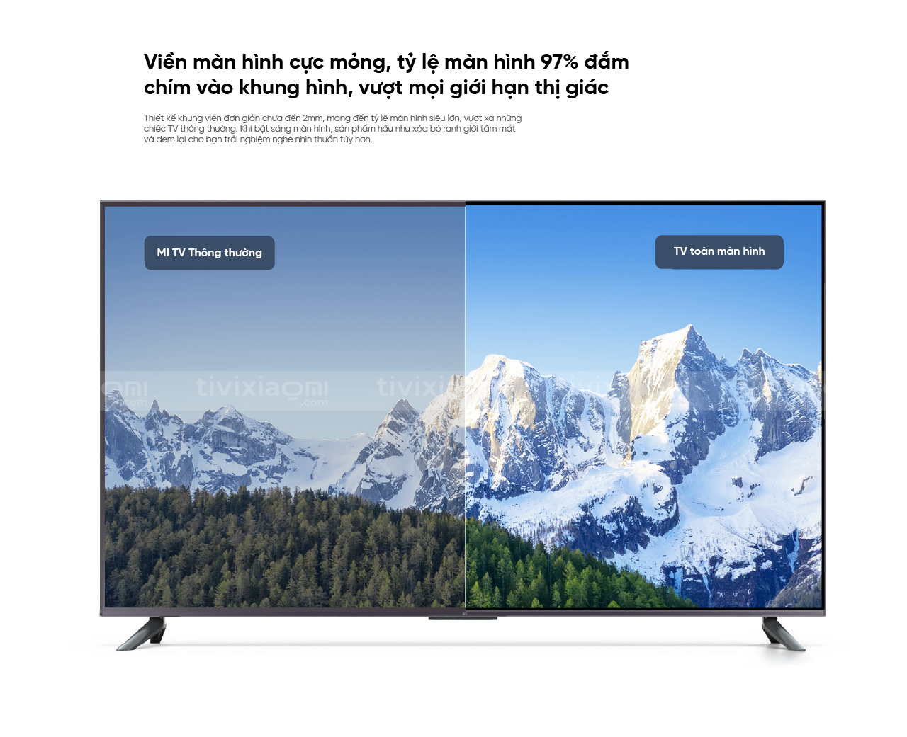 Thiết kế khung viền đơn giản chưa đến 2mm, mang đến tỷ lệ màn hình siêu lớn, vượt xa những chiếc TV thông thường. Khi bật sáng màn hình, sản phẩm hầu như xóa bỏ ranh giới tầm mắt và đem lại cho bạn trải nghiệm nghe nhìn thuần túy hơn.