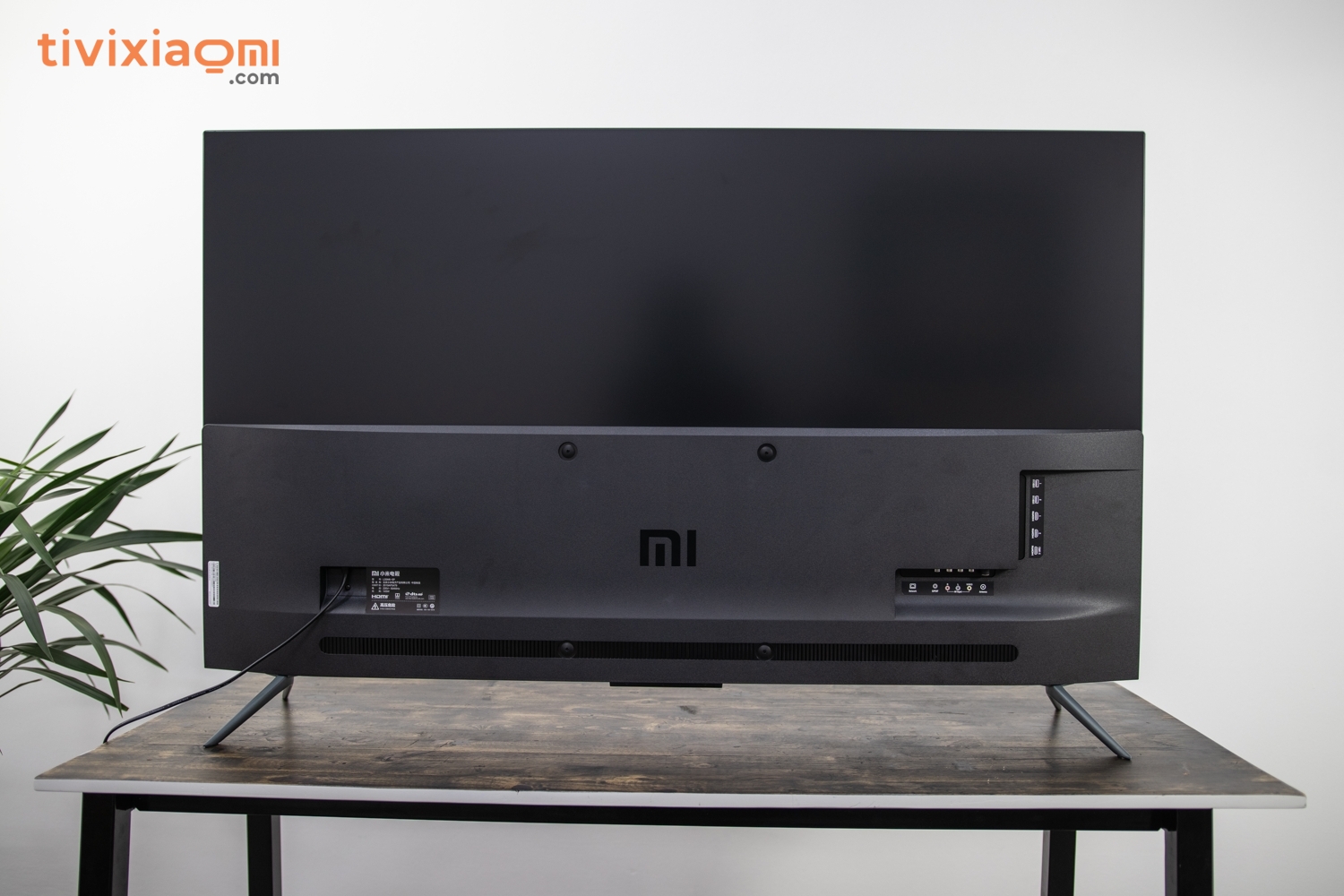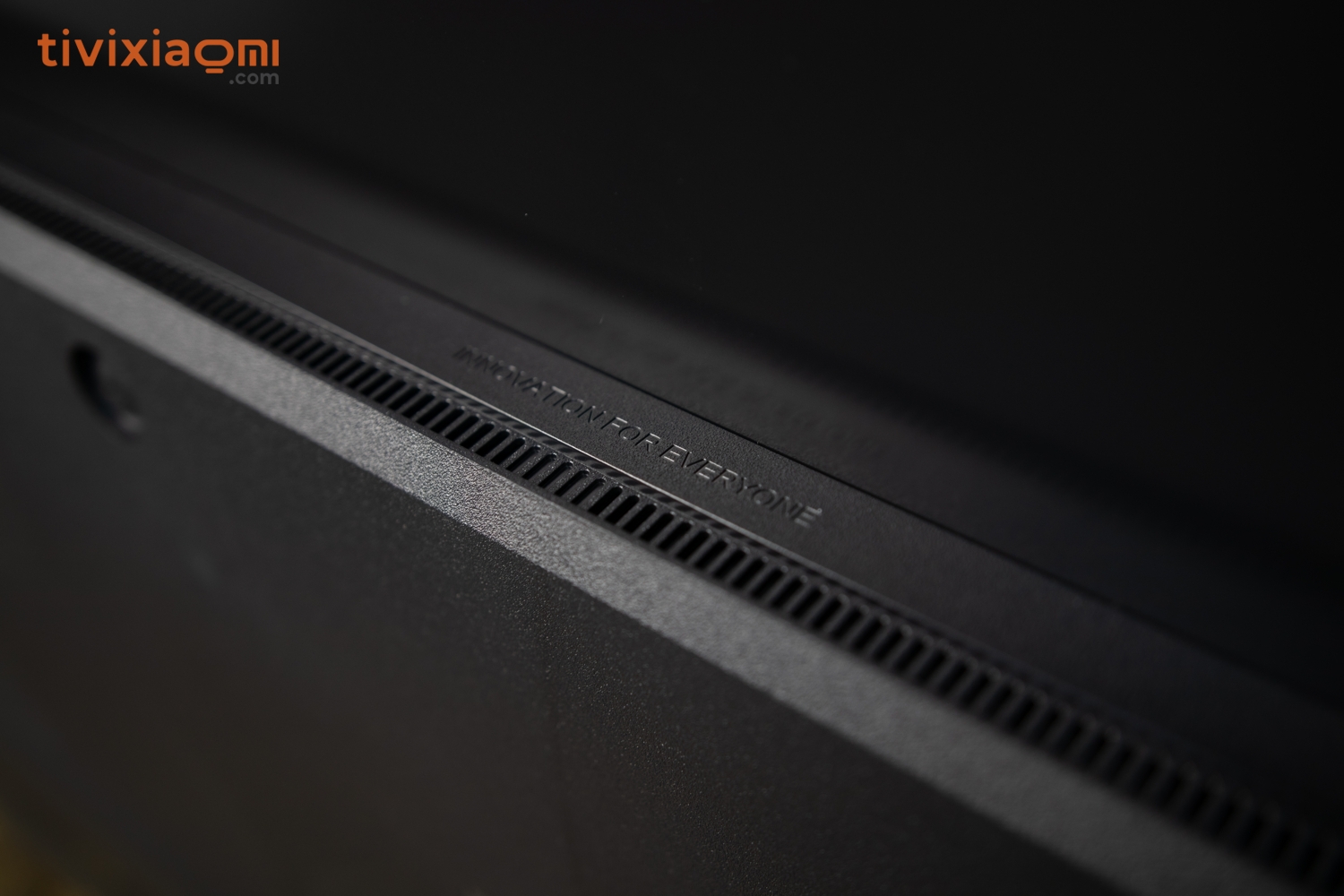 Ở phần chính giữa chúng ta có đây là Logo Mi đi kèm theo là 4 con ốc 4 góc để bắt giá treo Tivi lên tường, và cạnh bên trái chúng ta có vị trí của dây nguồn nối liền trực tiếp với Tivi không thể tháo rời. Và đương nhiên chúng ta vẫn có khu vực của dải loa ngoài được thiết kế tương tự như chiếc Mi Tivi 5 mà thôi, tuy nhiên chúng ta sẽ có một dòng chữ khẩu hiệu của Xiaomi đó chính là “inovation for everyone”
