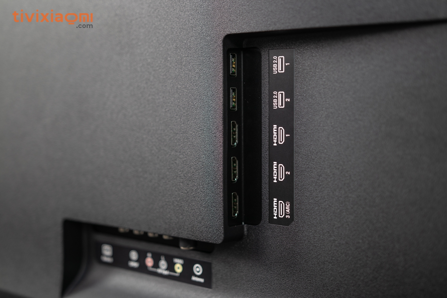 Ở phần mặt sau ở phía nửa trên chúng ta có lớp nhựa nhám ốp vào tấm panel của màn hình, ở phía nửa dưới chúng ta có các thành phẩn như là các cổng kết nối của chiếc Tivi Xiaomi Mi Tivi 5 Pro này, chúng ta vẫn sẽ có 2 cổng kết nối USB, 3 cổng HDMI, tiếp theo ở phía cạnh dưới chúng ta có 1 cổng ante, một bộ cổng AV, một cổng SPD/IF và cuối cùng là một cổng mạng LAN.