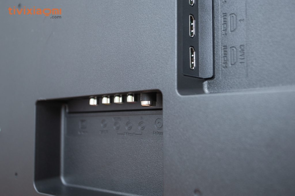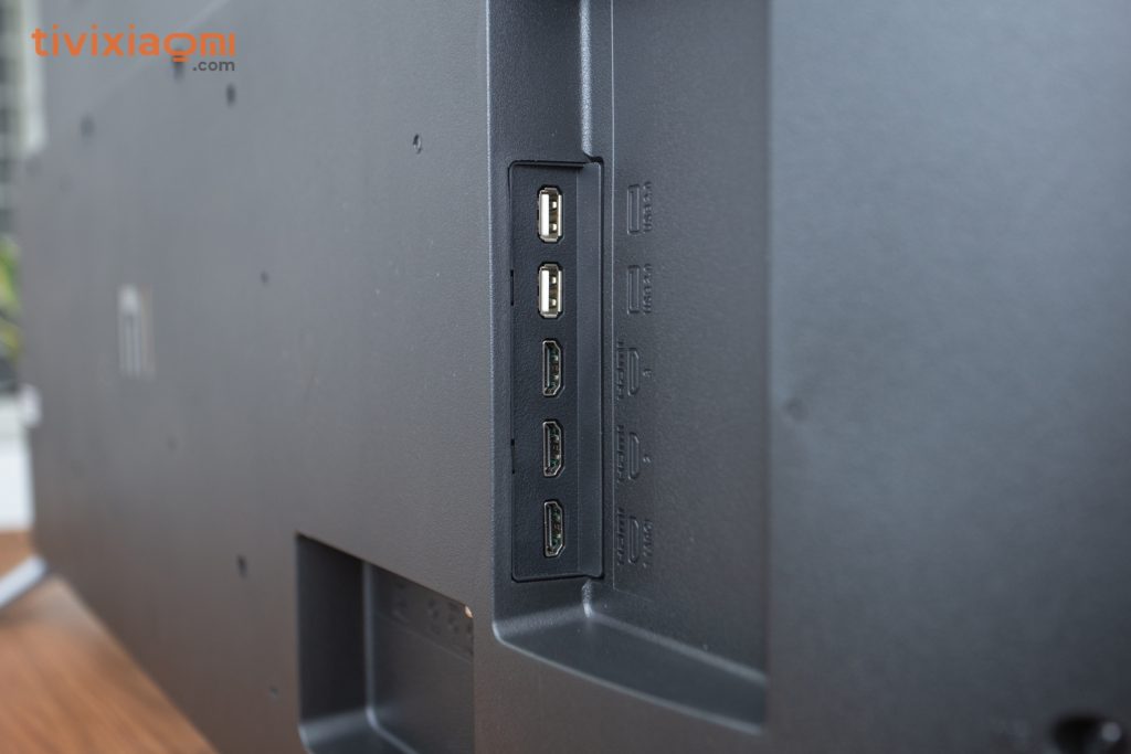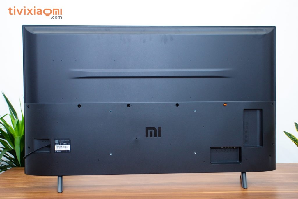 Đến phần mặt lưng thì chúng ta sẽ có vị trí của các thành phần cơ bản như loa ngoài, cổng kết nối… rất quen thuộc cũng giống như các sản Mi Tivi khác. Phía bên phải chính cho sẽ có 2 cổng USB 2.0 và 3 cổng HDMI, khu vực phía bên dưới cùng sẽ có cổng Antena, AV, SPDIF và cổng LAN Khu vực chính giữa sẽ có Logo MI và đi kèm là vị trí của 4 con ốc bắt giá treo tường và cạnh phải là vị trí của dây nguồn.