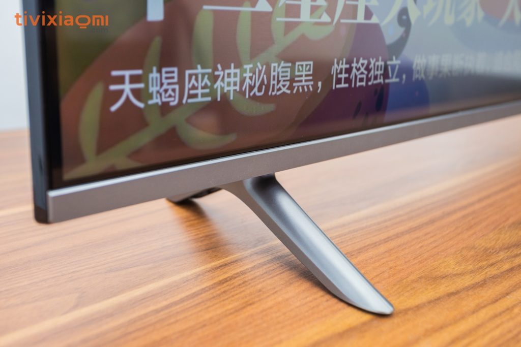 Đầu tiên thì nói qua một chút về thiết kế bên ngoài của sản phẩm, tuy chỉ là sản phẩm thuộc phân khúc giá rẻ của Xiaomi nhưng sản phẩm lại vẫn giữ được trên mình những nét tổng quan sang trọng khi mà so sánh với những sản phẩm khác trong tầm giá của nó. Nổi bật nhất có lẽ phải kể đến đó chính là mặt trước của sản phẩm rất mỏng, mỏng đều 3 cạnh trái phải và cạnh phía trên, cũng giống như bất cứ sản phẩm Tivi Xiaomi nào thì cạnh dưới của sản phẩm sẽ dày hơn một chút vì có chứa logo của Xiaomi. Phần chân đế vẫn được làm từ nhựa mà thôi, tuy nhiên thì sẽ có độ hoàn thiện rất cao cả 2 chân đế đi kèm này với độ chắc chắn rất tốt để giữ vững cho thân của chiếc tivi.