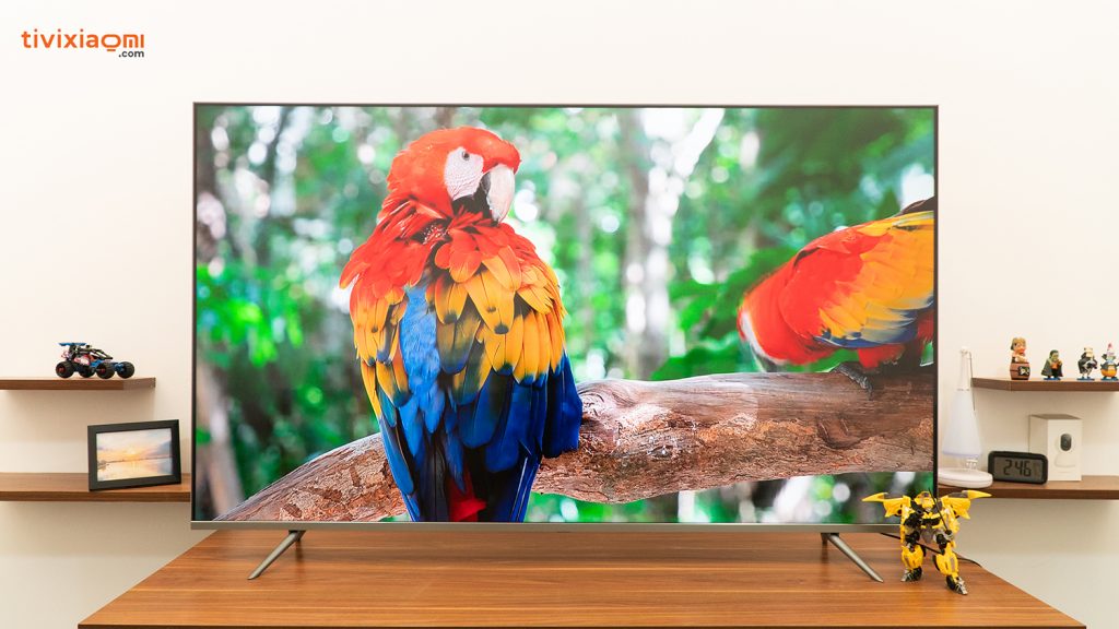Tấm nền của nó cũng được trang bị công nghệ chấm lượng tử, hỗ trợ gam màu rộng NTSC 108%. Ngoài ra thì màn hình của chiếc TV này còn cho góc nhìn cực rộng lên đến 178°, giúp chúng ta có thể xem rõ ràng từ rất nhiều góc trong phòng. Tất cả những điều mình vừa nêu trên đều là những tính năng chỉ xuất hiện trên những mẫu TV cao cấp, vậy nên dù màn hình của TV là rất lớn nhưng với sức mạnh phần cứng như vậy chúng ta có thể hoàn toàn tận hưởng hình ảnh rõ nét đến từng chi tiết, không bị vỡ/nhòe hình, với những gam màu sống động nhất.