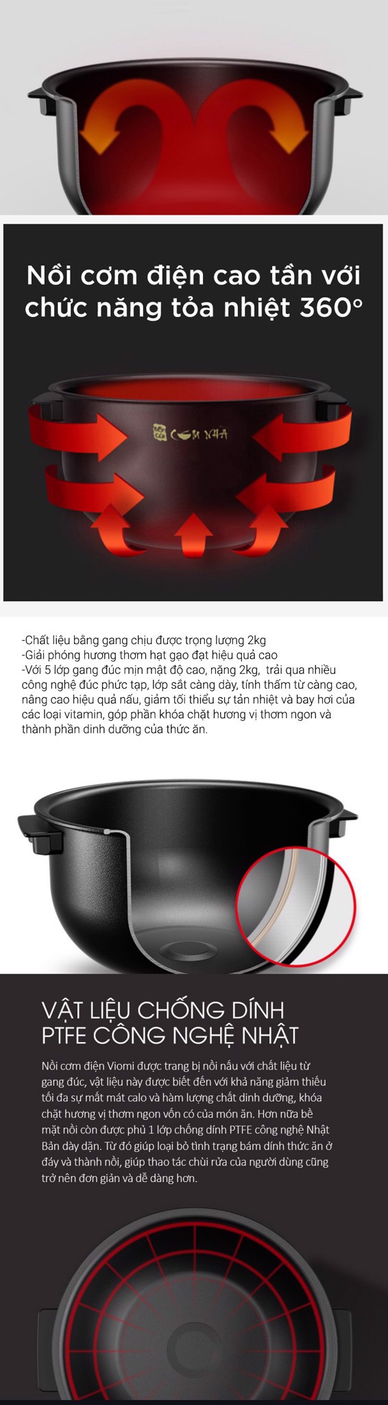 - Nồi cơm điện cao tần với chức năng tỏa nhiệt 360 độ, giúp nấu nhanh hơn mà vẫn giữ được mùi vì thơm ngon và hạn chế tiêu hao hàm lượng dinh dưỡng.