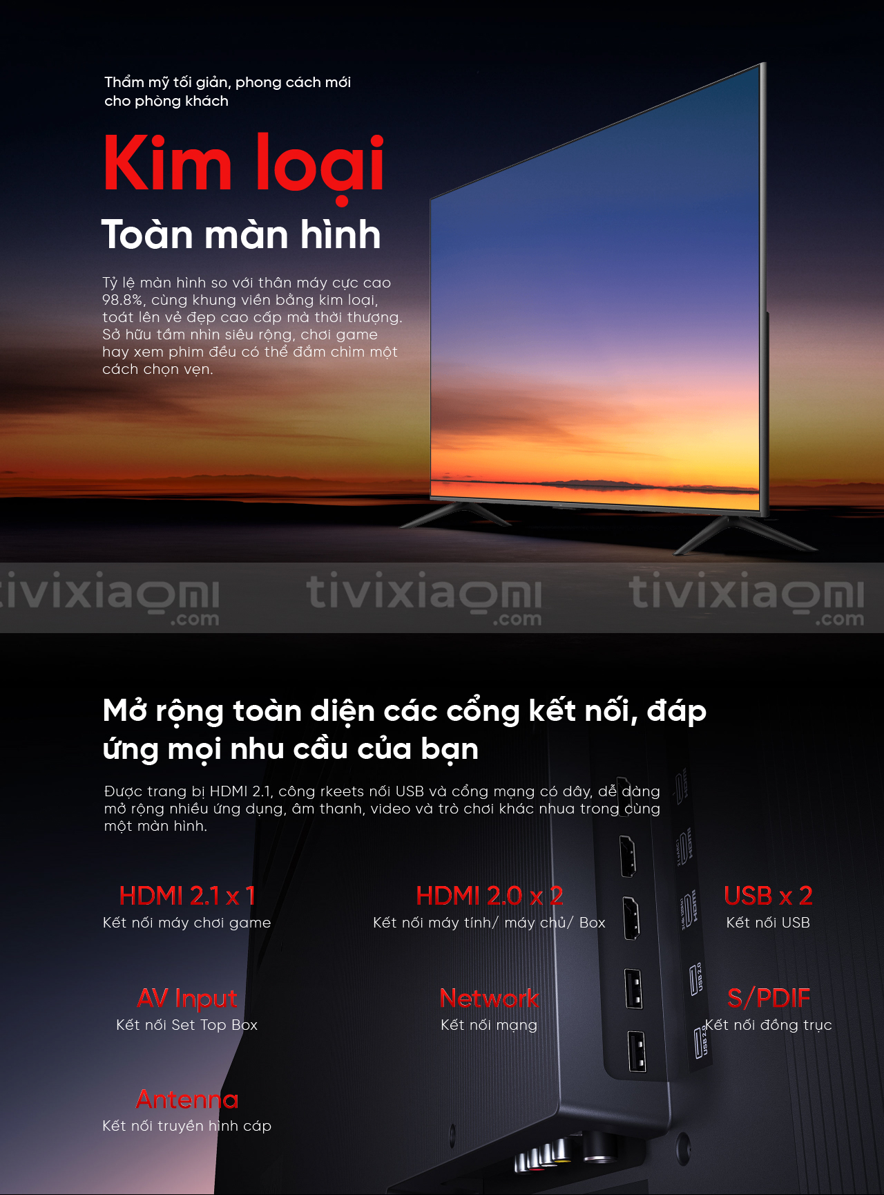 Các cổng kết nối bao gồm 3 cổng HDMI, tuy nhiên chỉ có một cổng là HDMI 2.1 và hỗ trợ Variable Refresh Rate (VRR – Tần số quét biến thiên). Ngoài ra còn có thêm 2 cổng USB-A 2.0. Theo Xiaomi thì TV này hỗ trợ chơi game tốt.