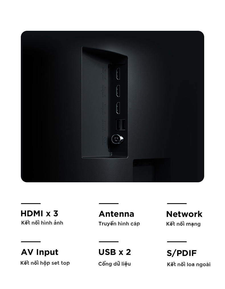 Tivi Xiaomi 4C 50 inch hỗ trợ nhiều cổng kết nối phổ biến như: HDMI, USB, Network, Antenna ,… giúp bạn kết nối với các thiết bị ngoại vi để tận hưởng nhiều tiện ích trên tivi.