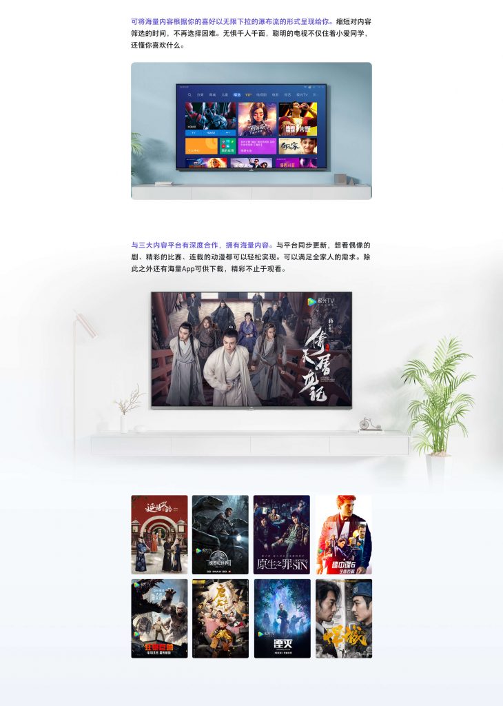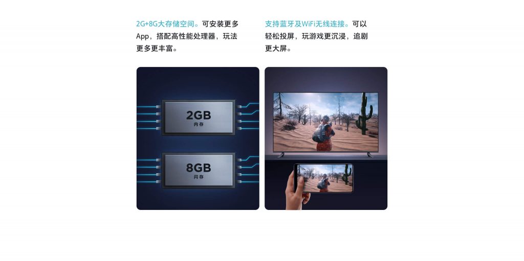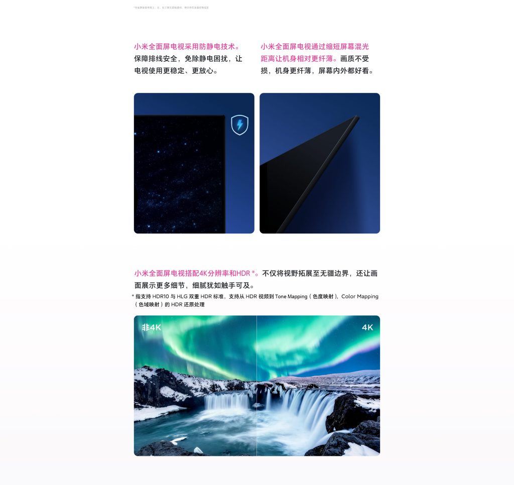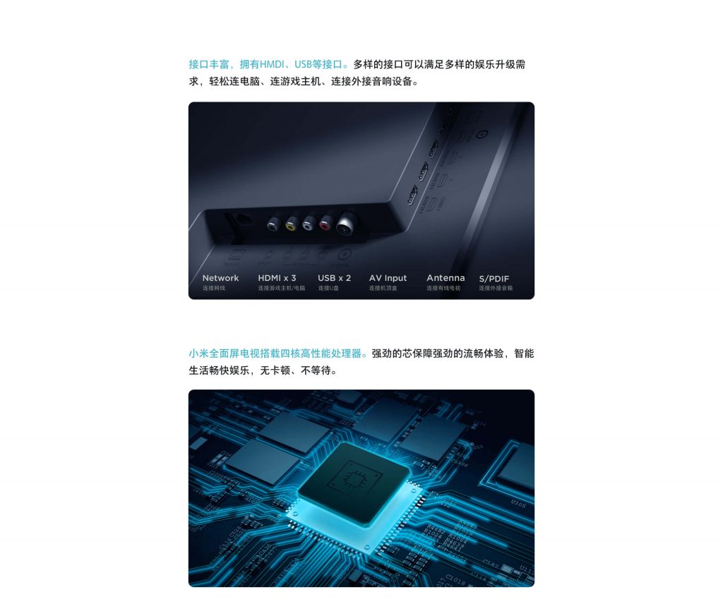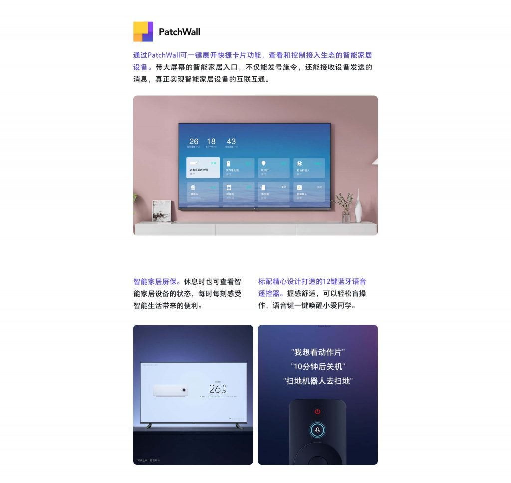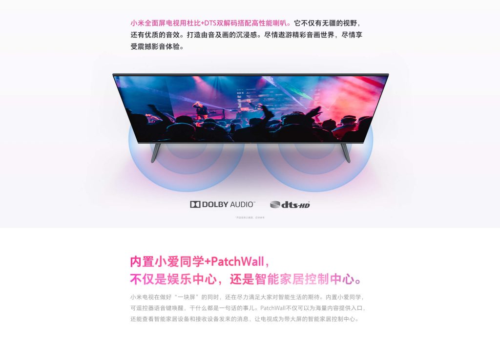 Xem phim trên màn hình lớn gây sốc hơn / thiết kế toàn màn hình thời trang và trường nhìn rộng hơn / Chất lượng hình ảnh siêu nét 4K tinh tế và chân thực / Âm thanh Dolby mang đến trải nghiệm đáng kinh ngạc / Điều khiển bằng giọng nói trong lớp Xiaoai thuận tiện hơn / Hệ thống PatchWall thông minh / 2G + 8G lớn Không gian lưu trữ / Nội dung lớn đáp ứng nhu cầu xem của cả gia đình