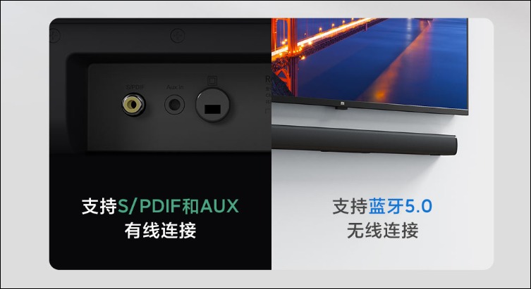 Redmi tivi Soundbar được trang bị 2 dải loa kích thước 45 x 80 mm, công suất 30 W, tích hợp khoang âm thanh loại ống, cho phép người dùng 2 tiện ích kết nối thông qua kết nối có dây S/PDIF và AUX hoặc Bluetooth 5.0.